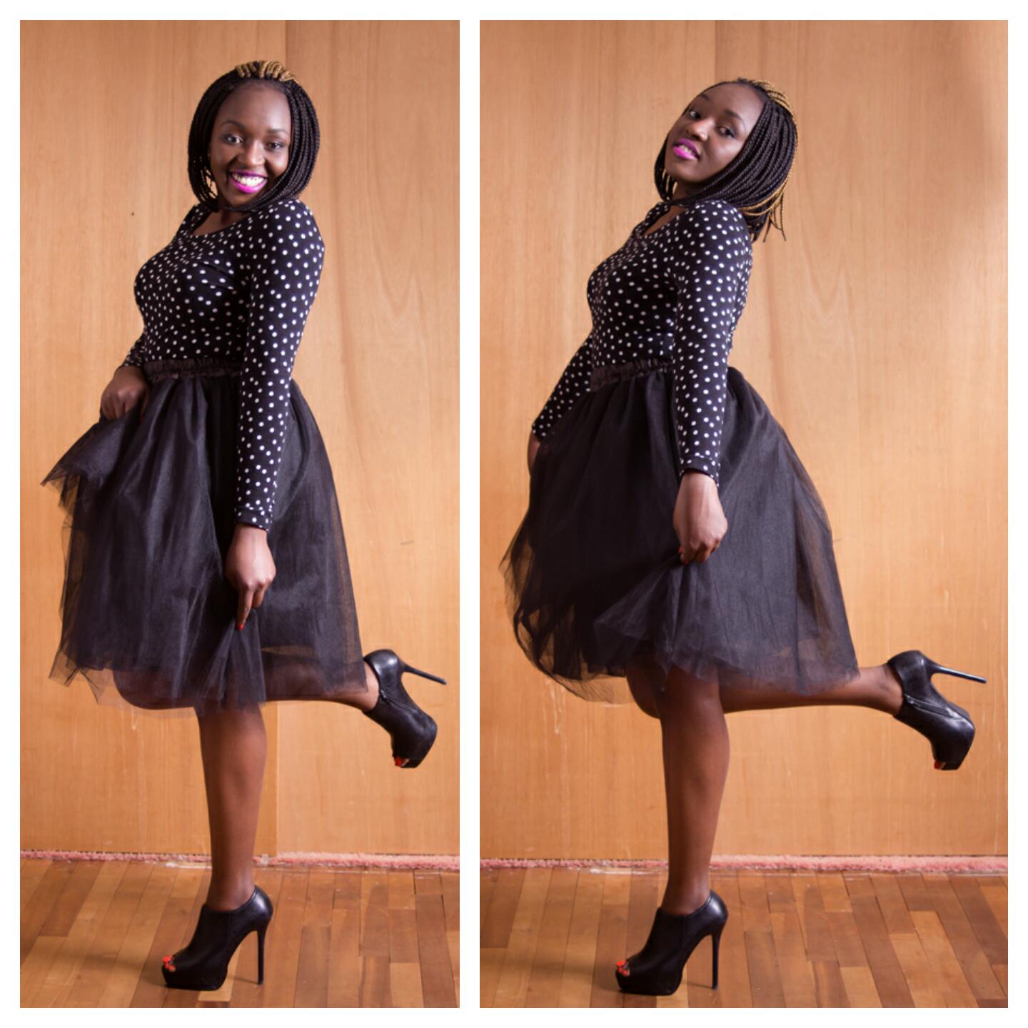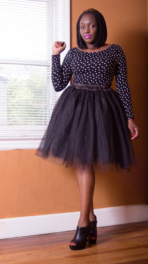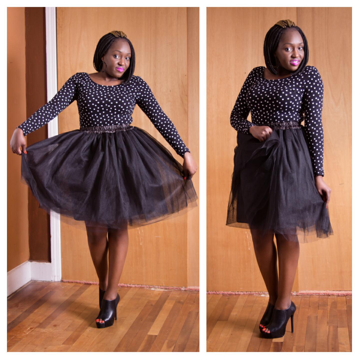 My love for tutu’s has been rekindled! As a little girl in Kenya, I remember wearing the tutu dresses especially for Christmas, New Year or Easter Holidays. If your family was like mine, those holidays called for new outfits and for some reason such dresses…Or am I on my own on this one? Anyway, imagine my feeling when I saw adult tutu skirts??!! I had to have one. However, I opted to be a little conservative by settling for a black one as opposed to other brighter colors. This was a fun shoot as it brought a lot of nostalgic moments. I paired my tutu skirt with a long-sleeved polka dot top and booties and was ready to hit the road. Let me know what you think!